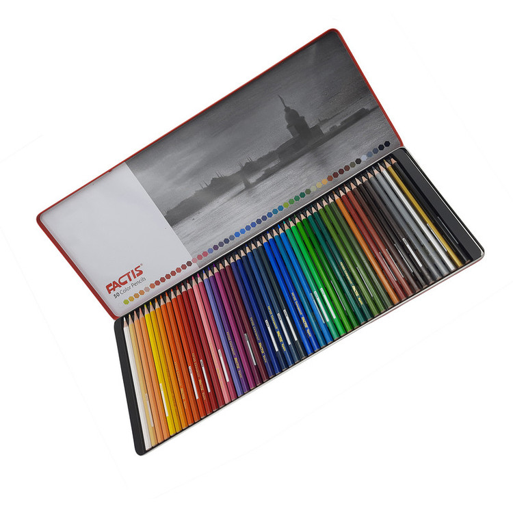 فکتیس (FACTIS) از برندهای با کیفیت در زمینه تولید لوازم تحریر و نقاشی است، مداد رنگی به عنوان یکی از ابزار مهم نقاشی و رنگ آمیزی برای هنرمندان می باشد؛ و مداد رنگی های فکتیس از نظر تراش، رنگ های جذاب، زیبا و شفاف و کیفیت رنگدانه، جزء بهترین ها هستند، این مداد رنگی بسیار نرم بر روی کاغذ کشده شده و رنگ شفاف و درخشان و پر رنگی بر جا می گذارد، این محصول با داشتن ۵۰ رنگ مختلف اغلب طیف های رنگی را شامل می شود، طراحی شش گوش و ارگونومیک مدادها را می توان از نقاط قوت مداد رنگی ۵۰ رنگ FACTIS دانست، به لطف این ویژگی، در هنگام نقاشی انگشتان دست خسته نمیشوند و مدادها از روی میز و دست، لیز نمیخورند، نوک این مداد رنگی از مقاومت بالایی در برابر شکن برخوردار است، مداد رنگی فکتیس مطابق با استاندارهای ایمنی EN71/III اروپا و تحت لیسانس کسور اسپانیا تولید شده است، 50 رنگ جذاب، در یک جعبه ی فلزی و زیبا قرار گرفته اند تا مانع آسیب مداد ها شود. مغزی نرم هر مداد، جنس چوب عالی، تراشیده شدن راحت، استحکام بالا در برابر فشار وارد شده از طرف دست، و ماندگاری بالای رنگ ها بر روی کاغذ، همگی از مشخصات و ویژگی های این محصول است؛ رنگ هایی خارق العاده را با مداد رنگی ۵۰ رنگ FACTIS بر روی کاغذ بنشانید.