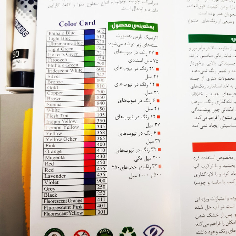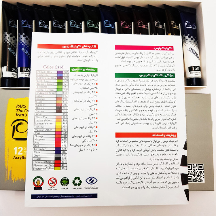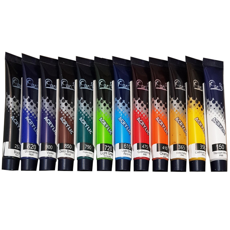 رنگ اکرلیک پارس شامل 12 رنگ متفاوت با حجم 21 میلی گرم میباشد. پیگمنت های بکار رفته در رنگ پارس از مقاومت بالا در برابر نور و تغییرات جوی برخوردار بوده و خاصیت ثبات رنگی مناسبی دارند. این رنگها از درخشش، پوشش و چسبندگی بالایی برخوردار بوده و پس از خشک شدن ، تثبیت شده و تغییر رنگ نمیده و قابلیت ترکیب رنگها با هم را دارد تا رنگهای جدید تری تولید شود.