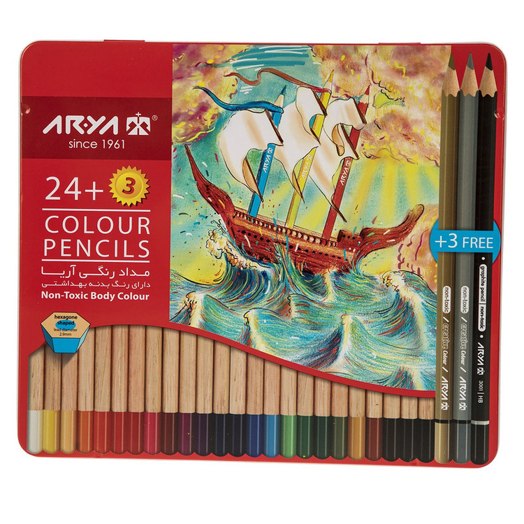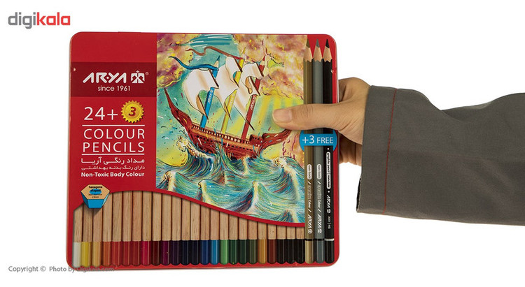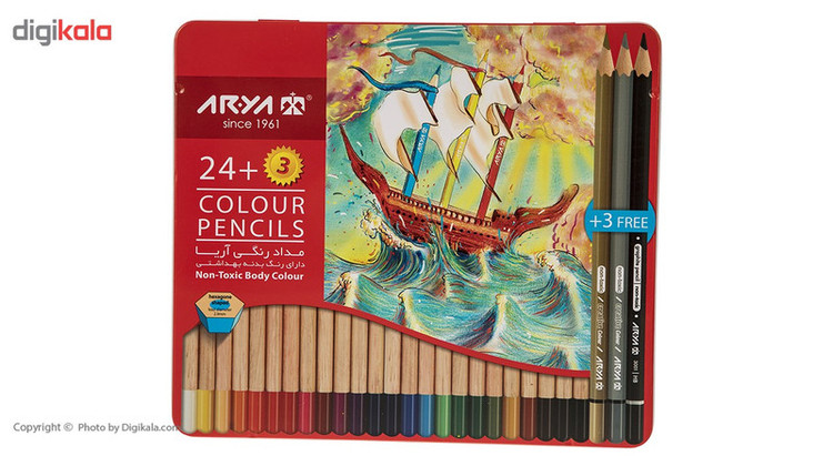 - رنگهای موجود در بستهبندی: 27 رنگ(3 + 24) - دارای سه مداد رایگان با رنگهای نقرهای، مشکی و طلایی - با رنگهای درخشان - دارای نوک محکم و مقاوم در برابر شکستن - با قابلیت تراش آسان - غیرسمی - مناسب برای افراد بالای سه سال